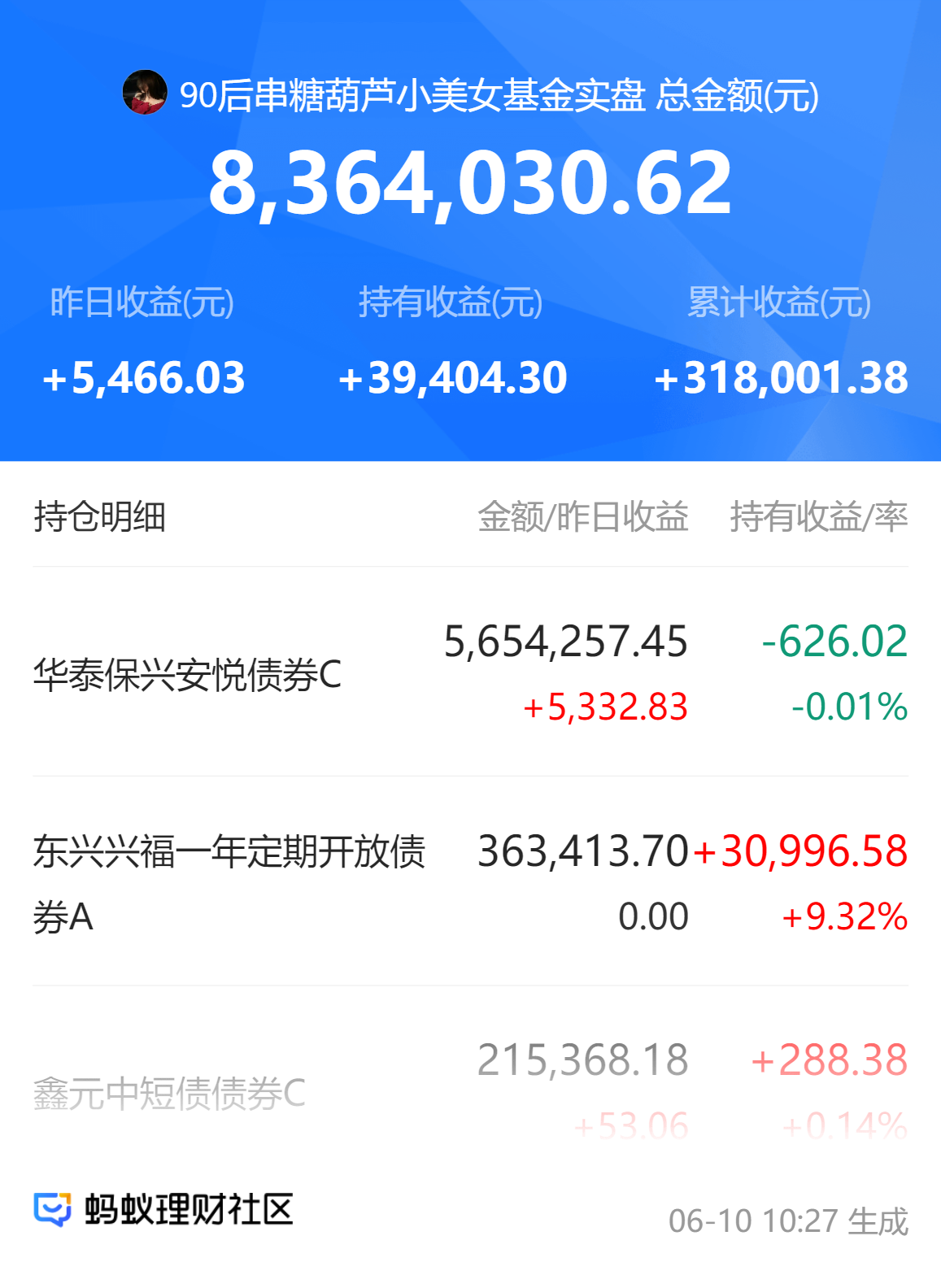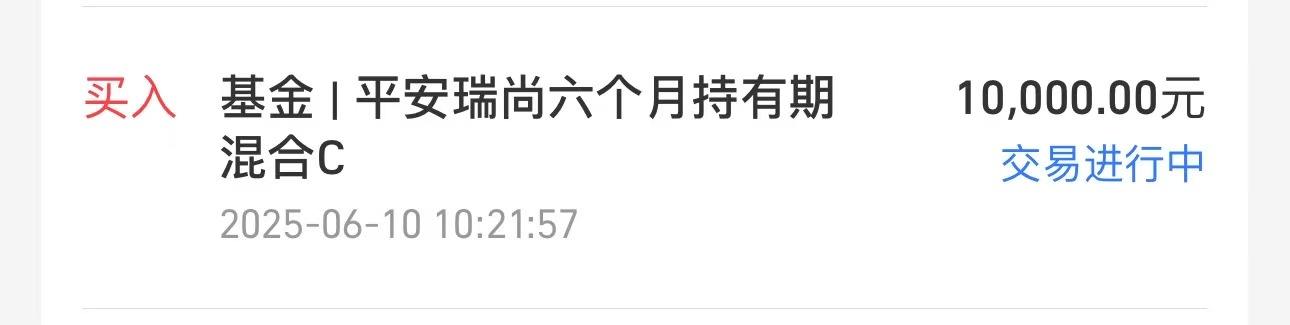 混债类:$平安瑞尚六个月持有混合C(OTCFUND|010244)$+1万,平安瑞尚是一支股债2/8开的混债,持仓主要以64%债券稳健打底,债券主要以城投债和利率债组合,权益以波段操作为主,整体交易灵活,业绩突出,昨天收110个蛋,近一个月收328个蛋,近一年收1086个蛋,各维度业绩均是正收益!相当不错!曾单日产蛋159个蛋,进攻能力强,大部分时候产蛋比权益类多,丢蛋比权益类少,整体走势也相当稳健,这点个人很满意!这支是六个月的产品,目前我持有了2个月左右,收益率在3.09%!今年来债市调整太过于频繁,当下看这类产品性价比也比单一的纯债高一些,且持有感也省心,所以继续追加一万看长期!