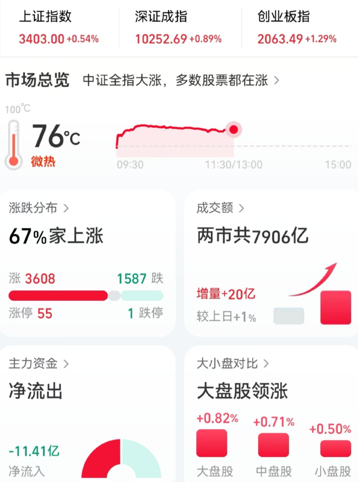 午评:三大指数全面反弹修复,午间收盘上证涨0.54% 深成指涨0.89% 创指收涨1.29% 沪深两市半日成交7906亿,较上个交易日增量20亿。个股涨多跌少,两市3608只个股翻红,1587只个股收绿