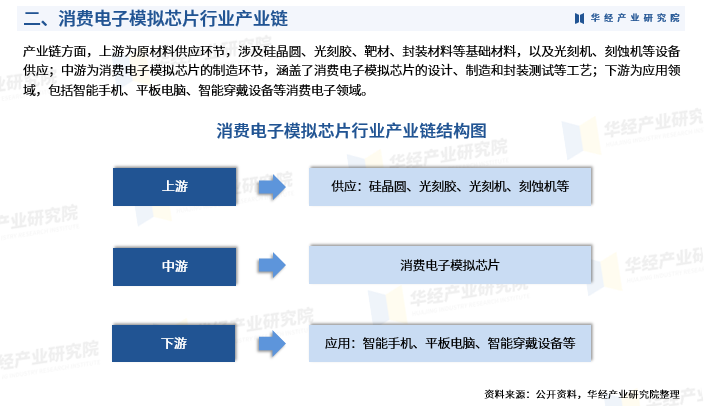 产业链方面,上游为原材料供应环节,涉及硅晶圆、光刻胶、靶材、封装材料等基础材料,以及光刻机、刻蚀机等设备供应;中游为消费电子模拟芯片的制造环节,涵盖了消费电子模拟芯片的设计、制造和封装测试等工艺;下游为应用领域,包括智能手机、平板电脑、智能穿戴设备等消费电子领域。