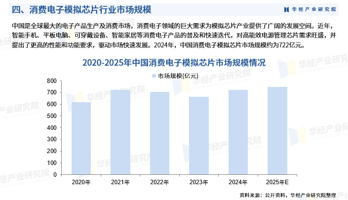 中国是全球最大的电子产品生产及消费市场,消费电子领域的巨大需求为模拟芯片产业提供了广阔的发展空间。近年,智能手机、平板电脑、可穿戴设备、智能家居等消费电子产品的普及和快速迭代,对高能效电源管理芯片需求旺盛,并提出了更高的性能和功能要求,驱动市场快速发展。2024年,中国消费电子模拟芯片市场规模约为722亿元。