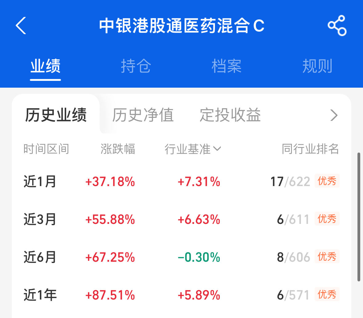 它的近一年涨幅飙到了87.51%,太猛了,而且各个阶段的表现都是优秀,且排名非常靠前,这个就很难得了,所以我选择了它来继续加仓。