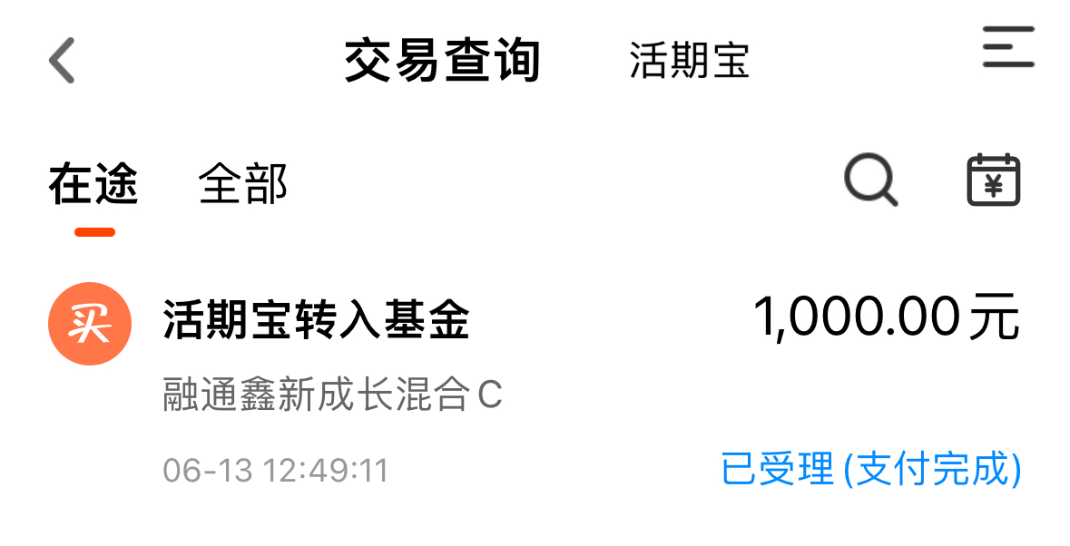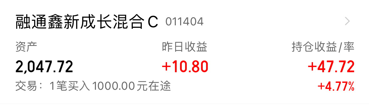 我今天实盘续加了1000元的$融通鑫新成长混合C(OTCFUND|011404)$