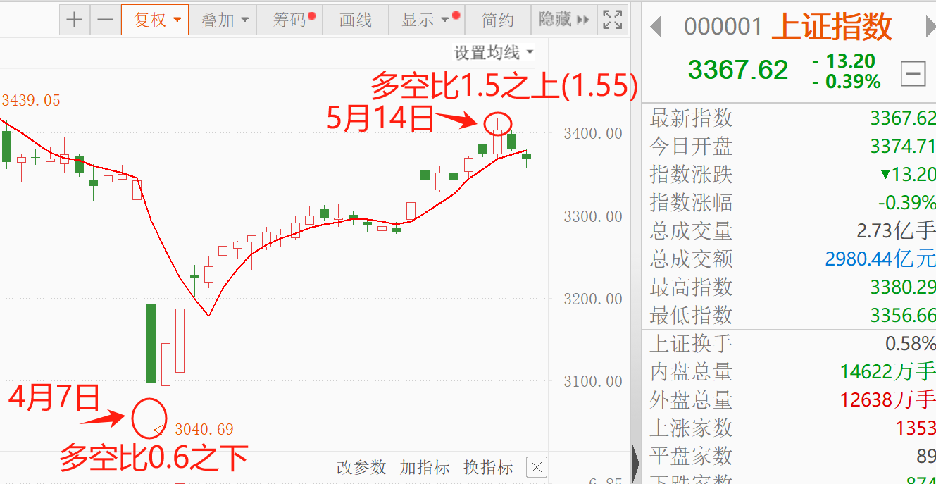 5月14日,多空比飙到1.5之上,绝佳卖点。