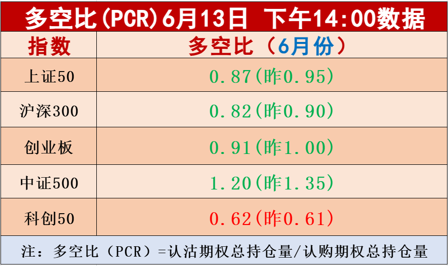 6月份的多空比,截至14:00,多空比数值是0.87,和前一个交易日的0.95相比,数值下降,看涨部位减少。