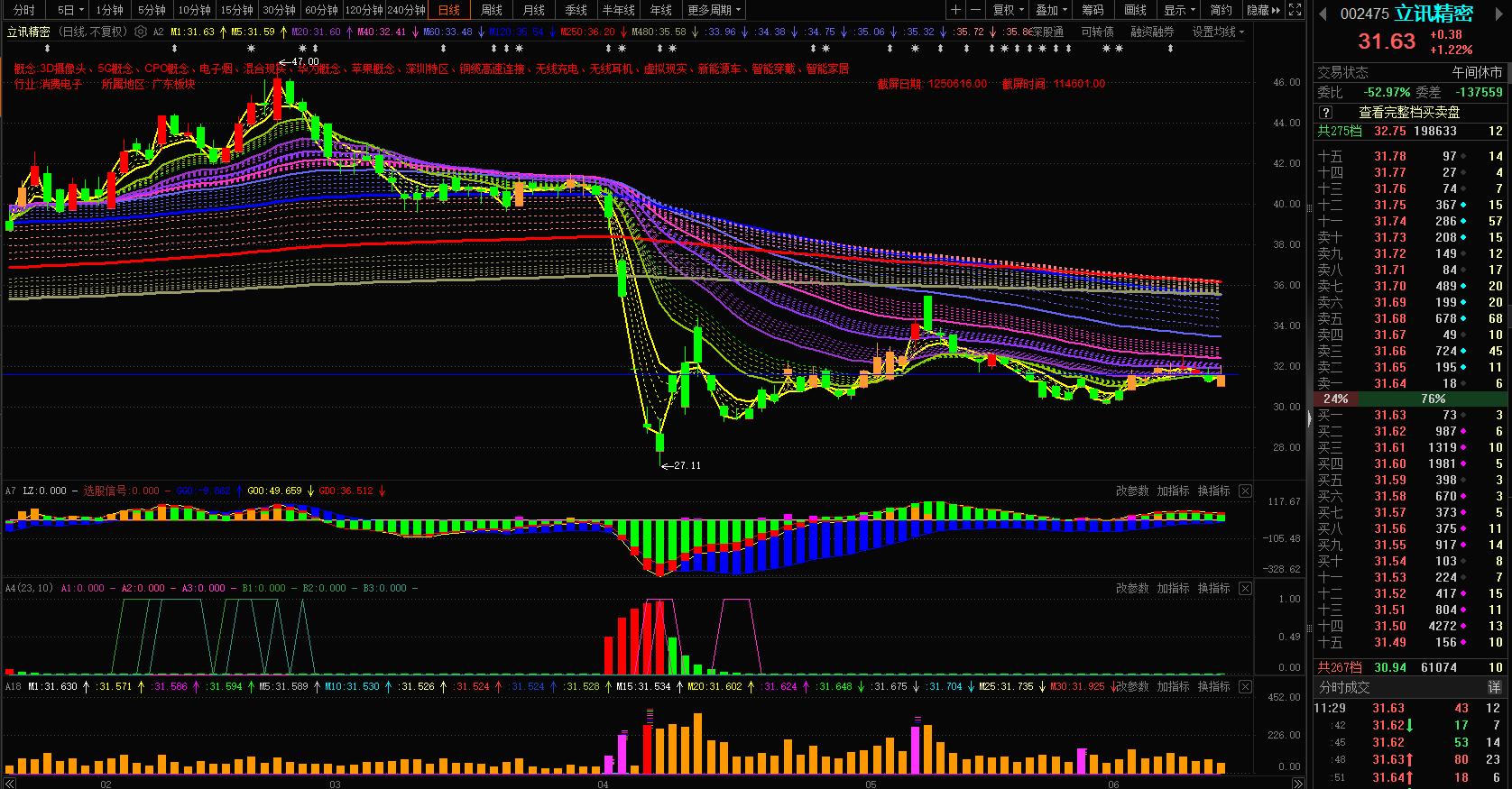 通过分析主力资金的控盘程度,可以判断其对股价的影响力。从筹码分布情况来看,近 3 个月立讯精密主力资金控盘程度处于中度偏上水平。主力通过长期布局,持有一定比例筹码,对股价走势有较强引导能力。在股价下跌过程中,主力资金通过承接抛盘,稳定股价;在上涨阶段,通过集中资金推动股价上升。例如,11 月中旬股价快速反弹阶段,主力资金集中买入,推动股价在一周内上涨约 5% ,显示出较强控盘能力。