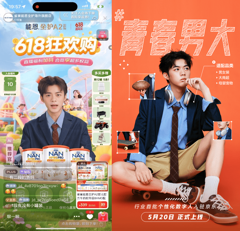 雀巢就选用了新上线的“青春男大”形象开启直播,这是由青年演员罗殿夏的形象复刻而来。借助京东·成长加速计划,雀巢使用最新推出的高商业可用数字人,在6月实现店铺GMV环比增长39%,其中直播渗透率提升至9%,客群结构显著优化——老客复购率增长36%,新客转化率提升13%。