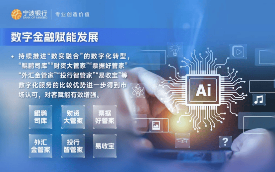 在当今的数字经济发展浪潮中,科技创新早已变成银行机构突破传统服务边界、持续做好金融“五篇大文章”的核心驱动力之一。作为深耕金融科技领域的城商行代表,宁波银行围绕客户体验、金融产品、营销经营及运营管理等四大领域,全面提升了金融科技在业务中的应用效能,推动自身业务的高质量发展。