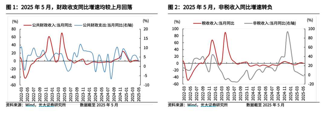 从近2个月的宏观数据来看,上周公布的财政数据显示,1-5月累计收支同比较上月出现双降。收入端的同比下降,主要受PPI回落、土地出让阶段性走弱、非税收入同比增速持续回落等因素的拖累;支出端出现同比下降的主要原因是专项债发行节奏总体偏慢、地方财政支出力度减弱等。