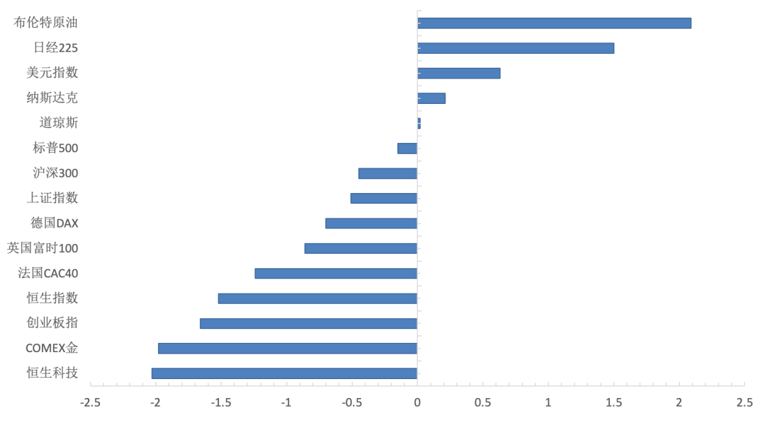 海外大类资产方面,美股三大指数在上周表现分化,道琼斯、纳斯达克上涨,标普500下跌;欧洲方面,除部分东欧股指外,欧洲主要国家大盘股指均下跌;亚太地区,日、韩、印度上涨,新兴市场大都收跌。商品方面,原油在上周大涨;基本金属中,沪铜下跌、伦铜上涨,铁矿石、铝、螺纹钢均收涨;贵金属主要品种在上周均下跌;农产品除棉花下跌外,其他主要品种在上周大都收涨。美元指数在上周上涨。