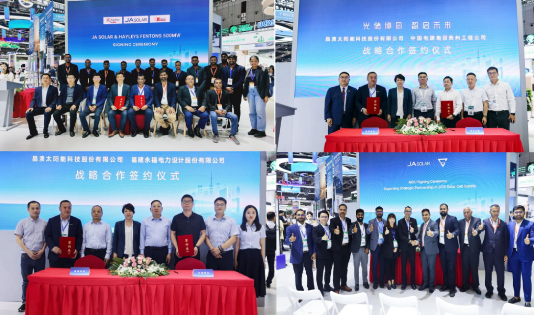 在本次上海展会期间,在本届展会,诸多国际新能源企业、机构来访,与晶澳科技开创合作、加深协同。展会现场,晶澳科技与KNACK ENERGY共同签署了高达2GW电池供货MOU协议,分别助力印度和洪都拉斯的清洁能源建设;与斯里兰卡最大的EPC承包商HAYLEYS FENTONS签署了一份500MW的组件采购协议;晶澳科技还与REMESA签署了一份总规模230MW的组件供货MOU协议。此外,晶澳科技还与福建永福电力设计股份有限公司、中国电建集团贵州工程公司、LIBRA ENERGY、SUNKIND ENERGY、ZONA SOLAR LOI分别签署了战略合作协议。