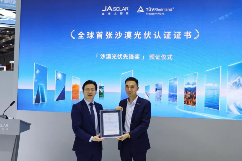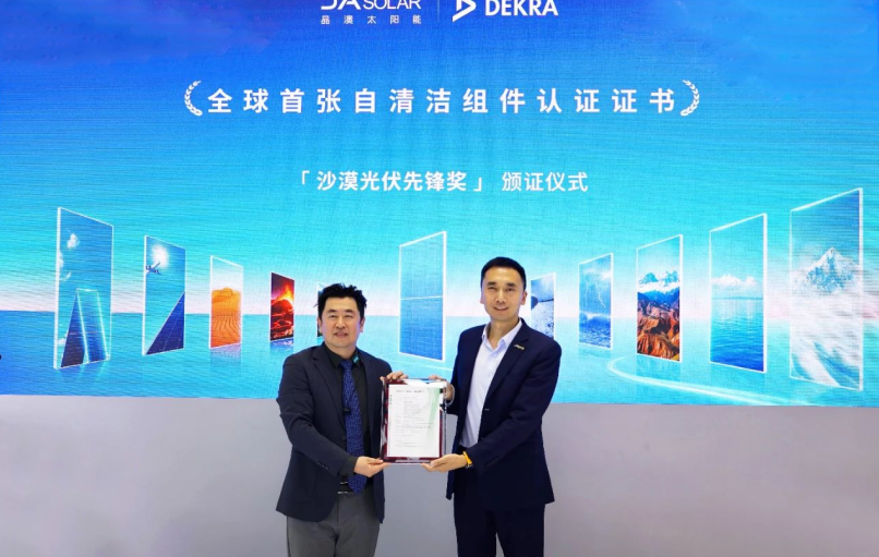 展会上,晶澳还举行了“极境寻光 全景见证”主题活动,众多全球权威认证机构齐聚一堂,同期发布了对晶澳全场景方案的各项测试结果,其中有多项认证实现了行业零的突破。此次活动上,TÜV莱茵为晶澳颁发全球首张“沙戈荒光伏组件认证”证书;国际知名认证机构DEKRA德凯同期为晶澳科技颁发了全球首张“自清洁光伏组件认证”证书。