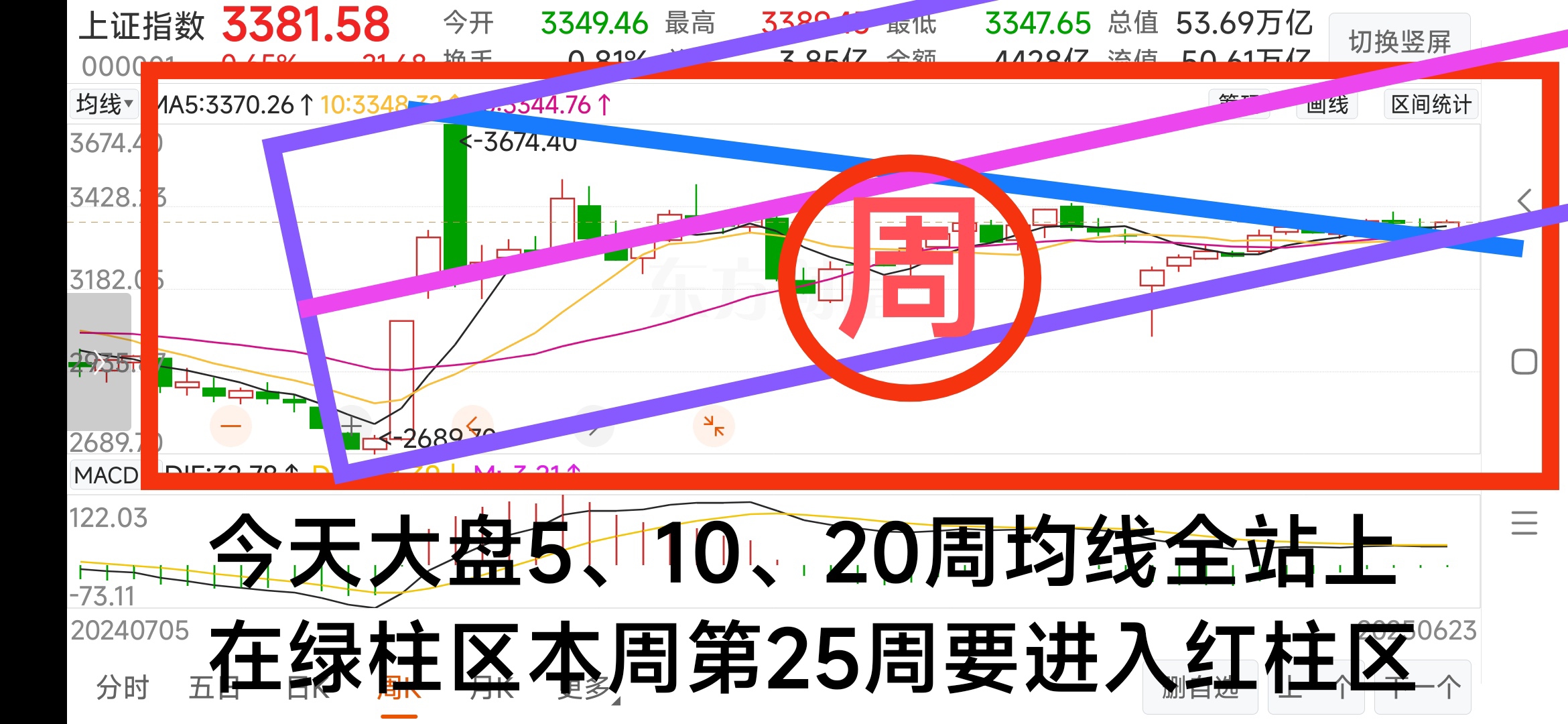 本周第二十五周我坚持看涨,大盘早晚周线调整会结束进入红柱区的……。