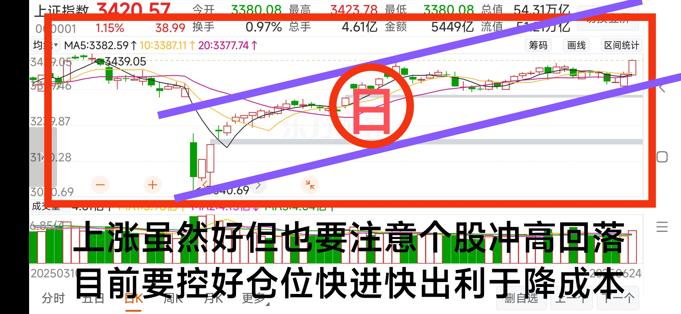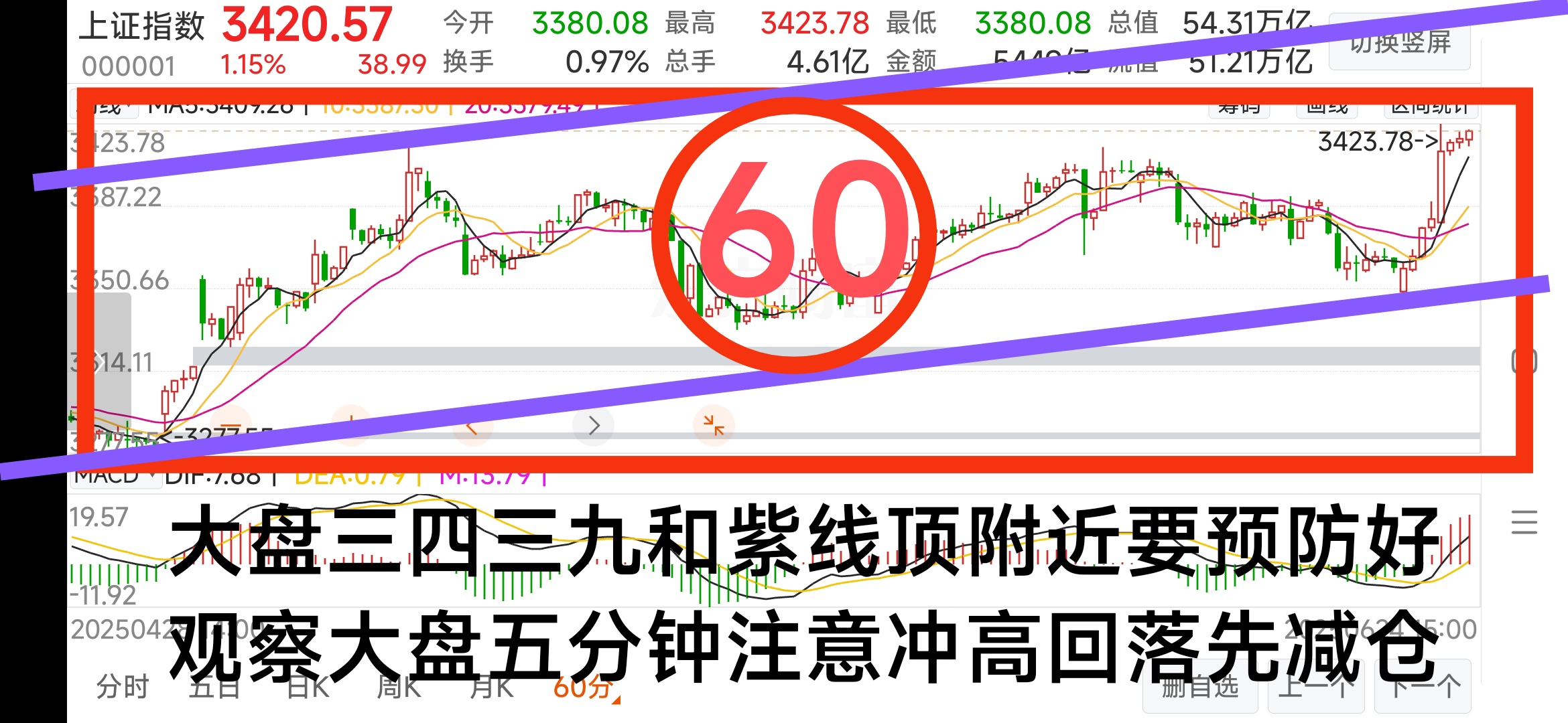 明天看大盘三四三九和紫线顶附近要预防好,目前大盘五分钟20均线全天都在强势上涨之中,再次冲高要回落看五分钟失守20均线减仓预防。