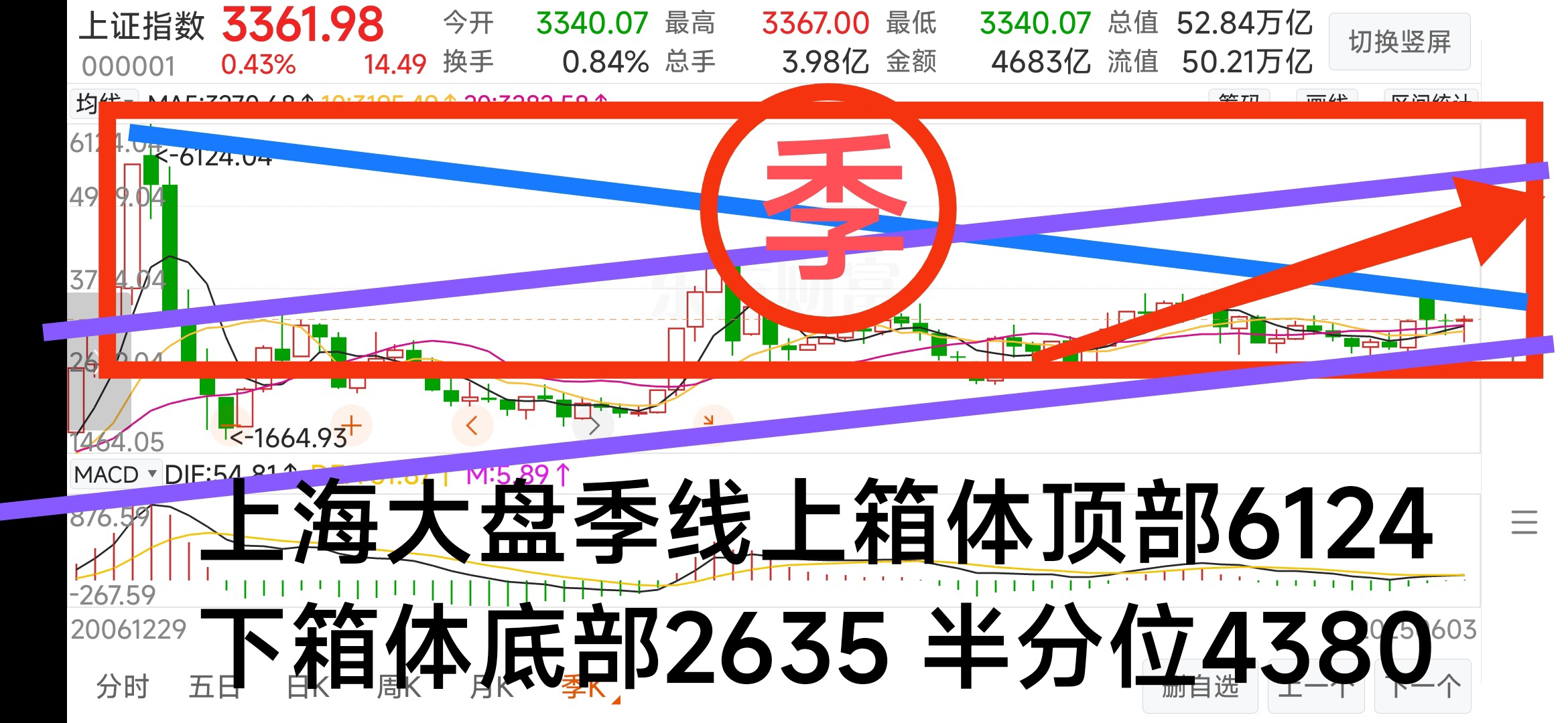 大盘季线大箱体顶部6124,去年箱体底部2635止跌企稳开始反弹,季线的威力无比,真正大涨起来很快就能到达半分位4380大牛市区,保护好手中该有的筹码,祝同行们持有的股票早日大涨提前进入牛市中。