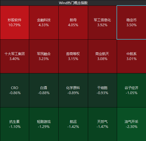 从板块来看,金融股再度走强,国盛金控等多股涨停,中、农、工、建四大行续创历史新高;军工股集体爆发,长城军工等10余股涨停;固态电池概念股一度冲高,天际股份等涨停。下跌方面,油气股延续调整,准油股份连续跌停。板块方面,军工、证券、互联网金融、跨境支付等板块涨幅居前,油气、影视、港口、美容护理等板块跌幅居前。