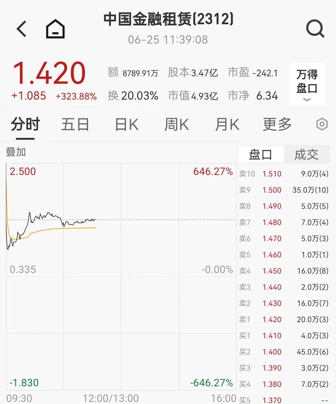 今日的港股市场上,除了国泰君安国际盘初暴涨超80%之外,中国金融租赁也引人注目。该股盘初一度飙升646%,报2.5港元/股,截至目前涨幅收窄至约323.88%,报1.42港元/股。