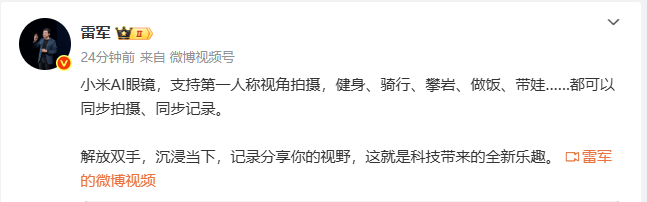 随后,雷军在自己的微博上为小米AI眼镜“打call”。据他透露,小米AI眼镜支持第一人称视角拍摄,健身、骑行、攀岩、做饭、带娃等场景都可以同步拍摄、同步记录。