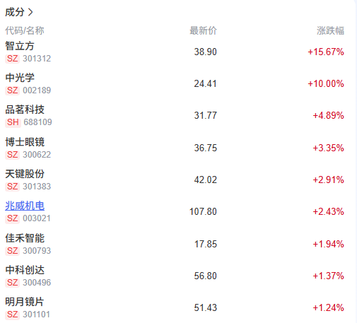 中光学亦直线拉涨停,智立方涨超15%,品茗科技、博士眼镜等跟涨。