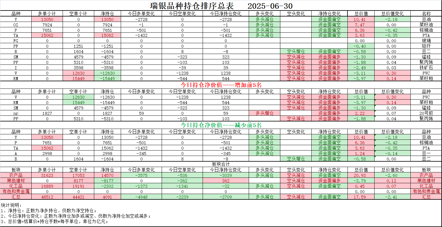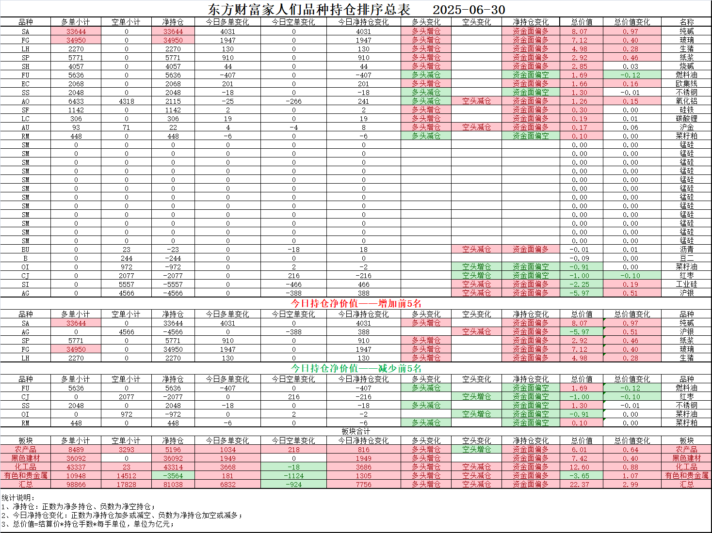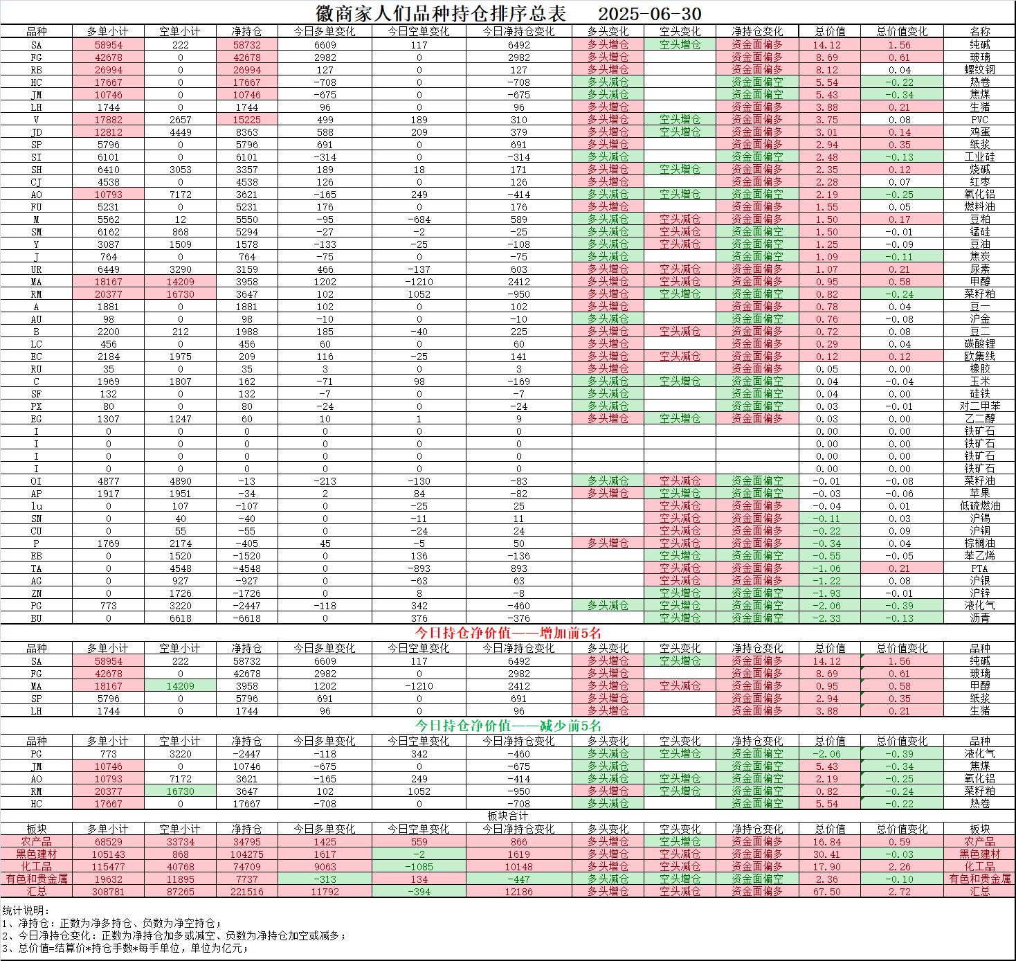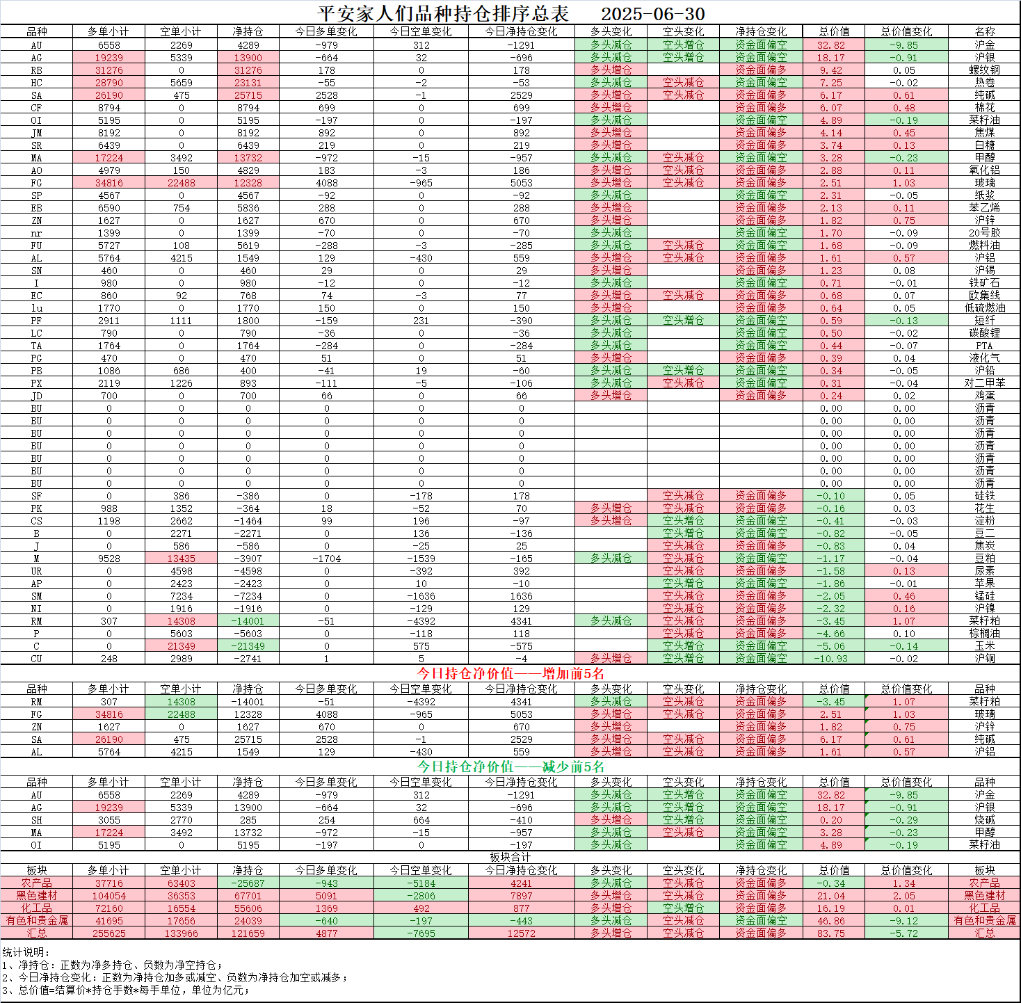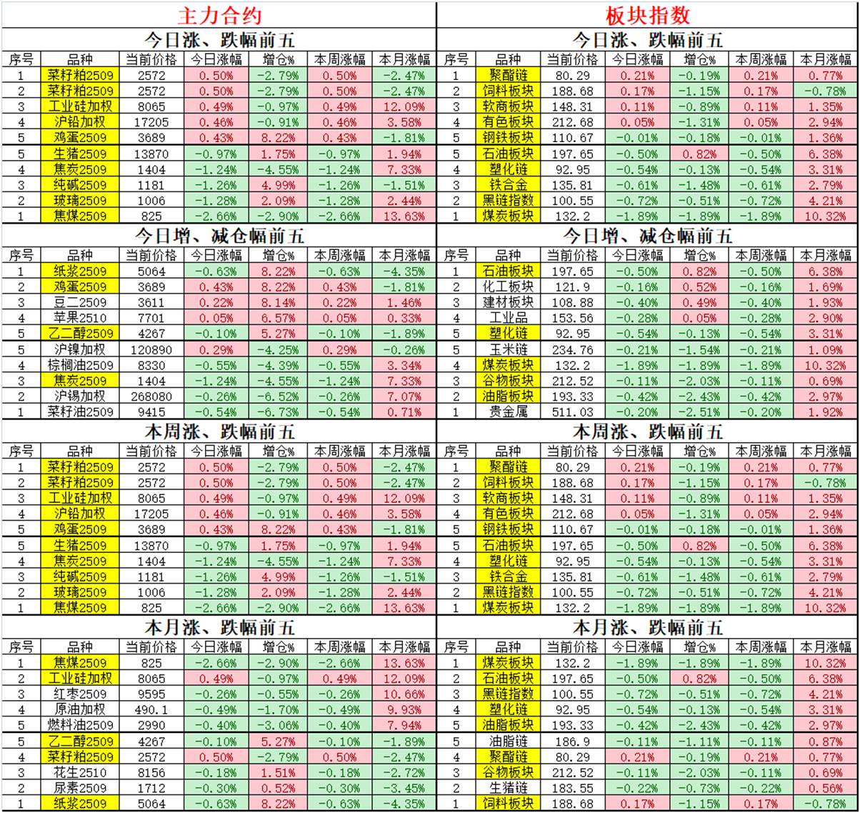 02、今日商品跟踪表:主要跟踪当前52个交易活跃的品种,对当日的品种涨跌幅、增减仓、板块指数的涨跌幅和增减仓进行排序;