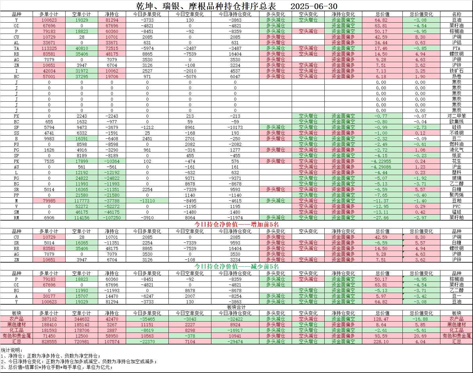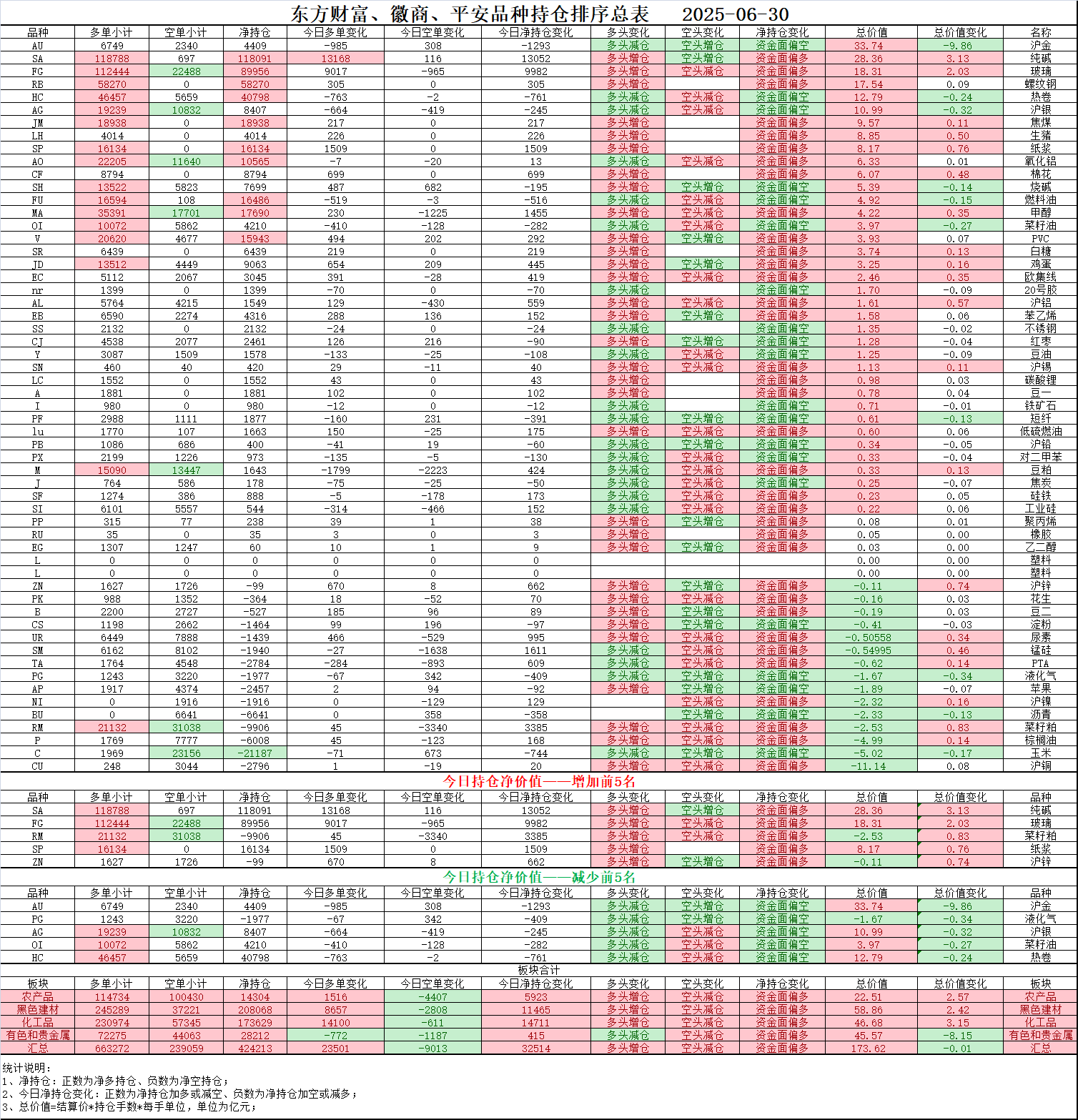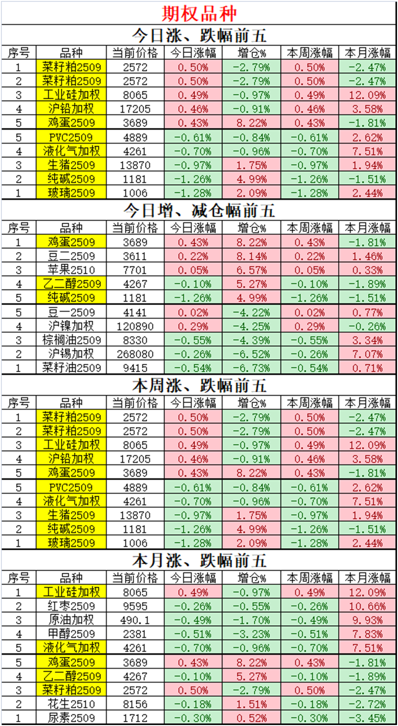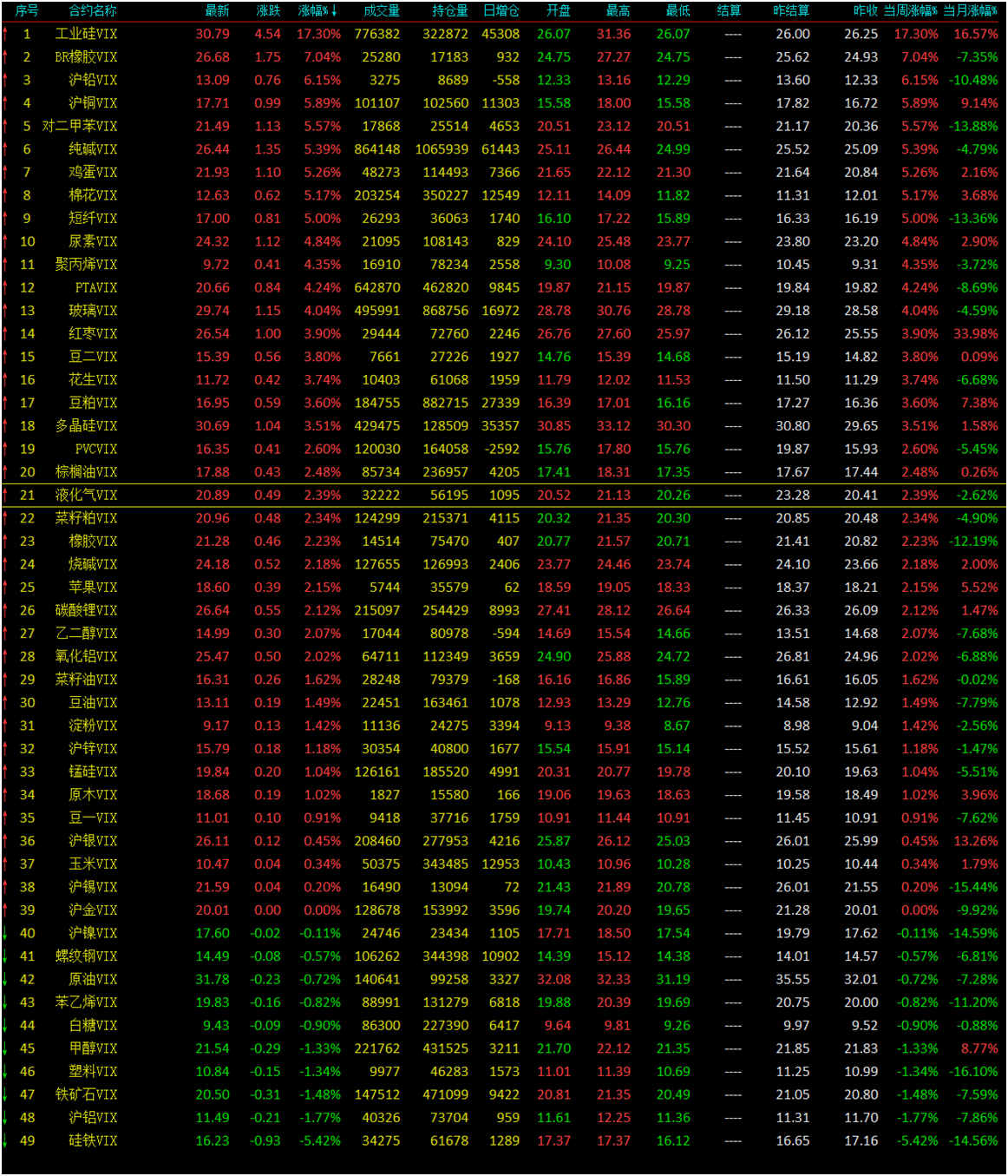 02、今日商品跟踪表:主要跟踪当前52个交易活跃的品种,对当日的品种涨跌幅、增减仓、板块指数的涨跌幅和增减仓进行排序;