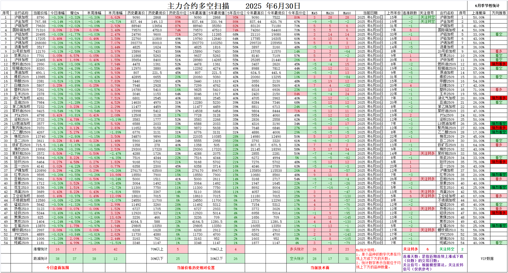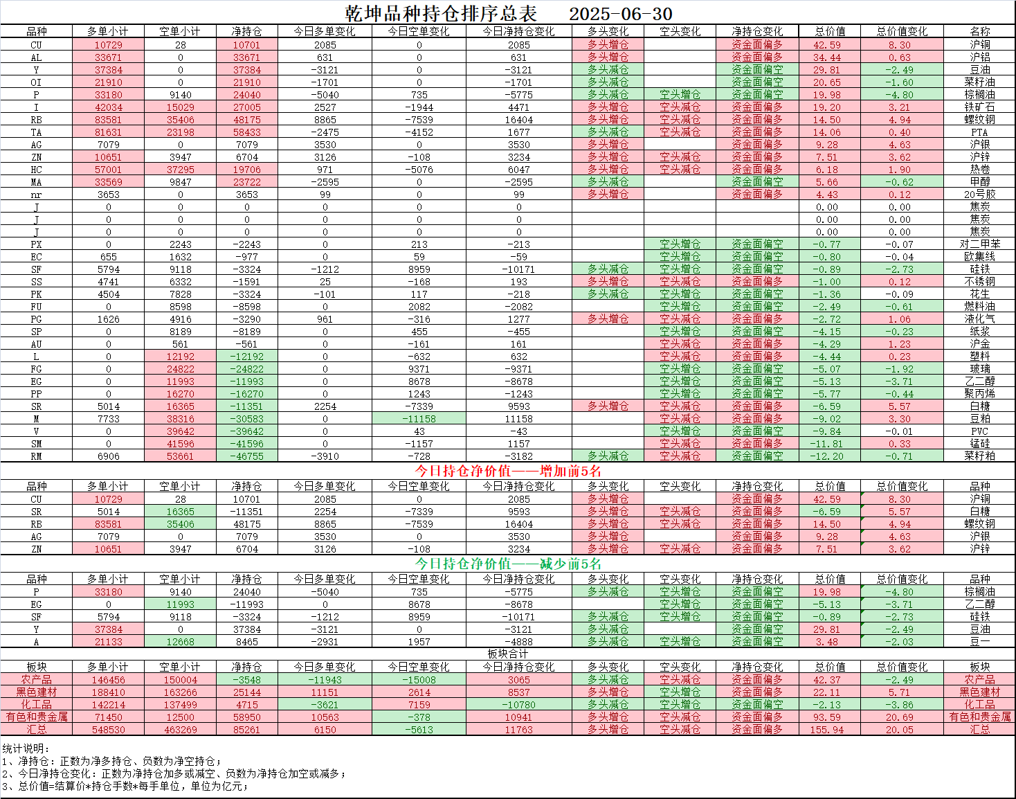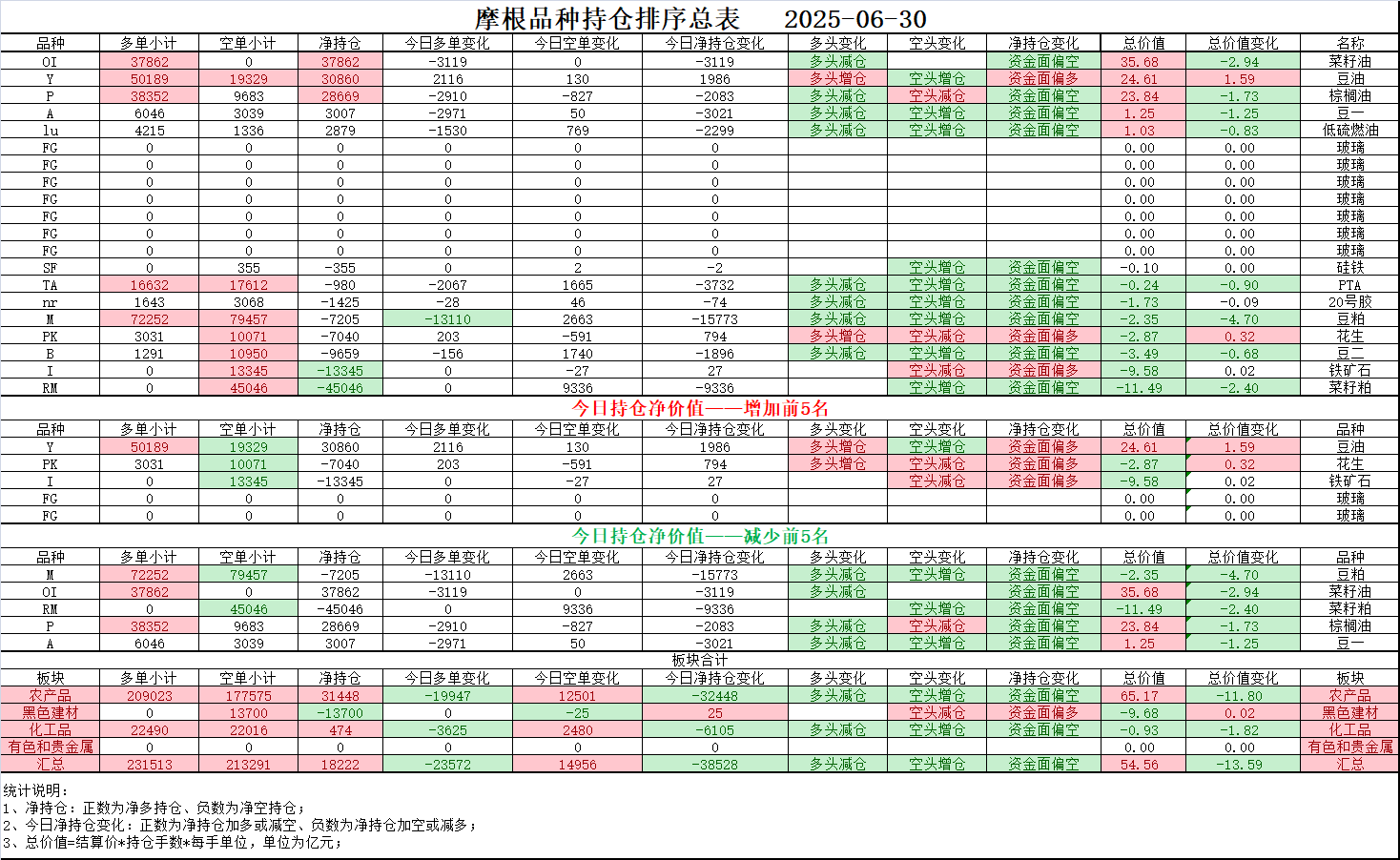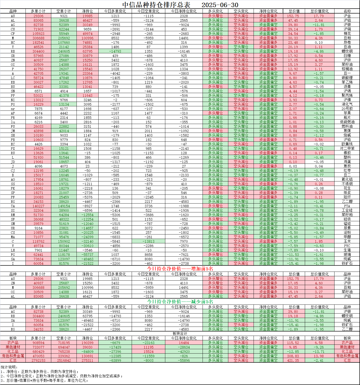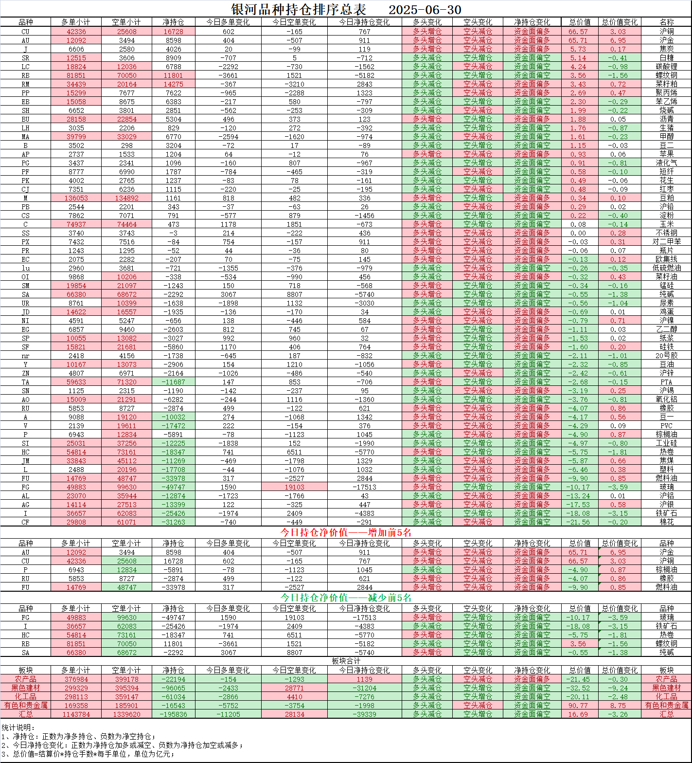 02、今日商品跟踪表:主要跟踪当前52个交易活跃的品种,对当日的品种涨跌幅、增减仓、板块指数的涨跌幅和增减仓进行排序;