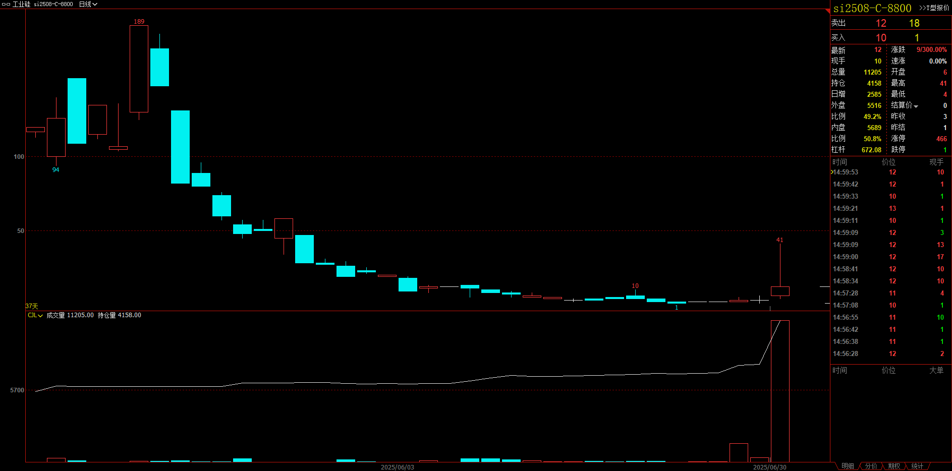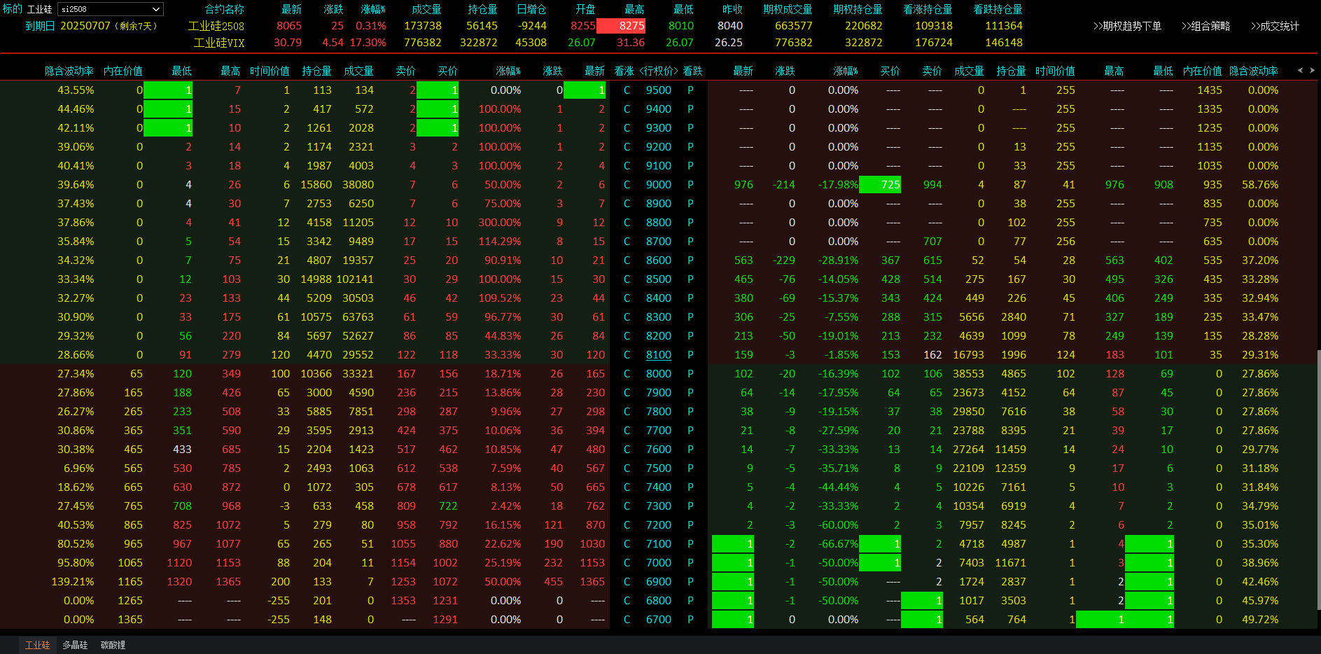 今日工业硅盘中触及涨停,带动认购期权盘中暴涨。