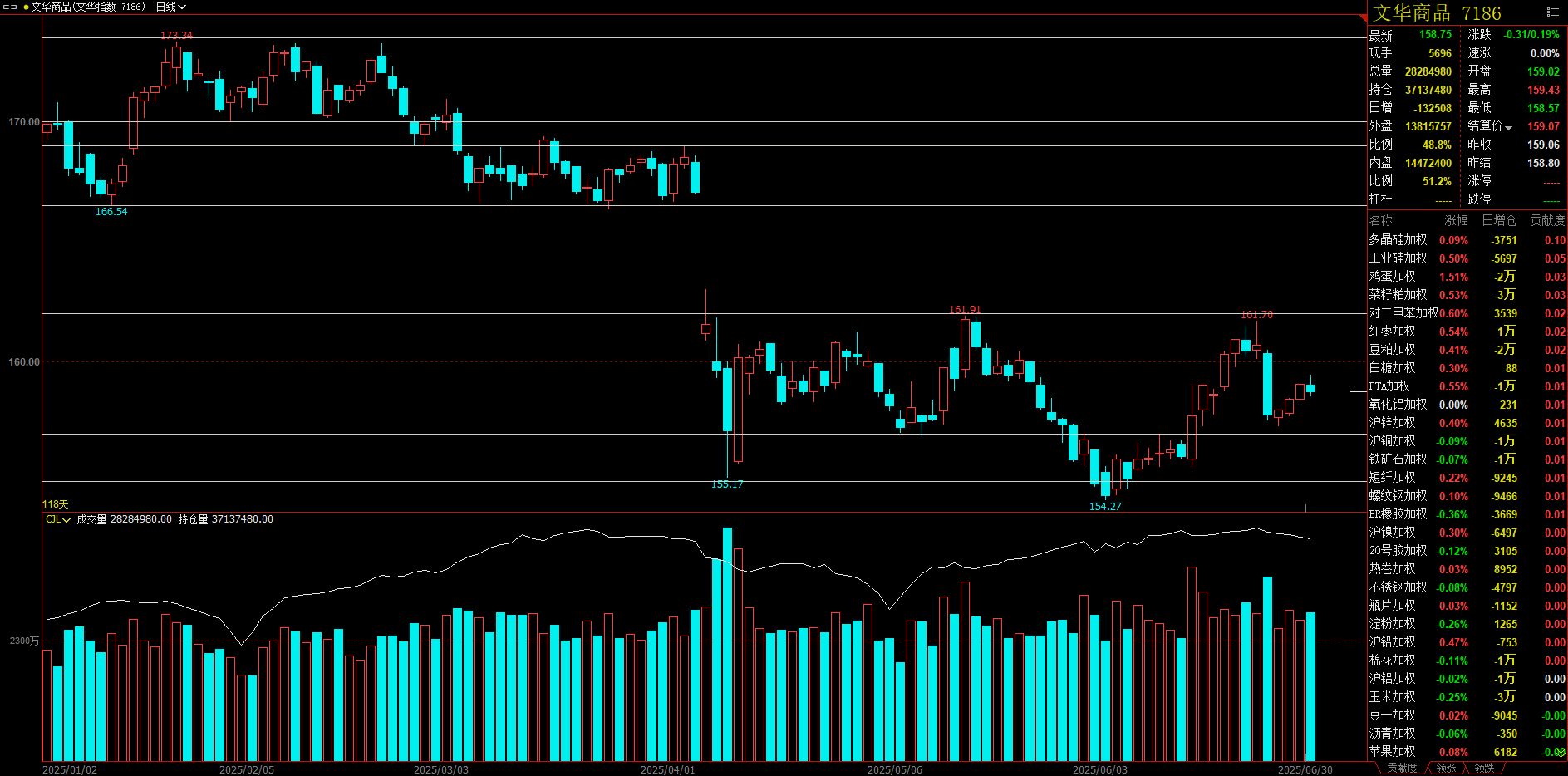 今日文华商品指数冲高回落,收跌在158.75,后续关注150-163的突破。