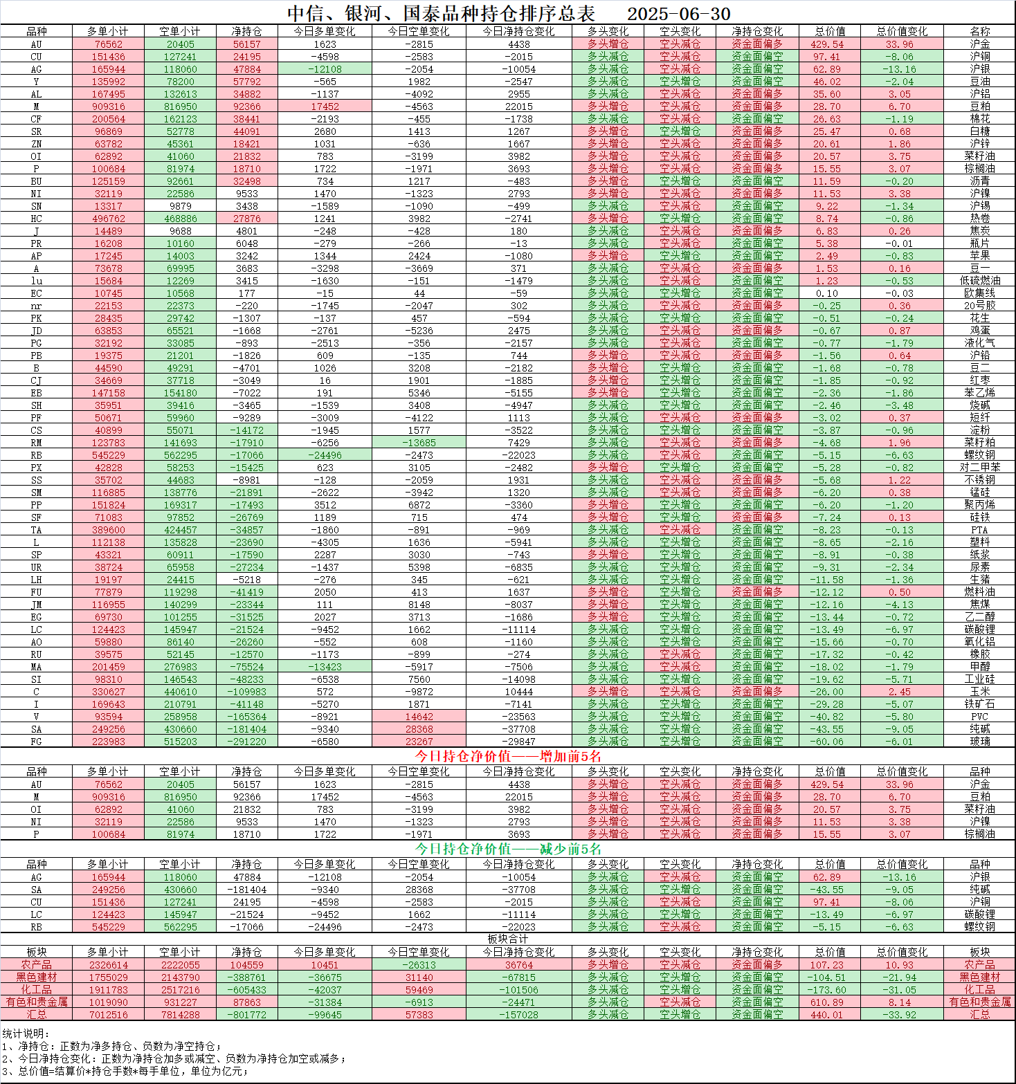 内资做多(加多、减空)前五:沪金+33.96亿,豆粕+6.7亿,菜籽油+3.75亿,沪镍+3.38亿,棕榈油+3.07亿;