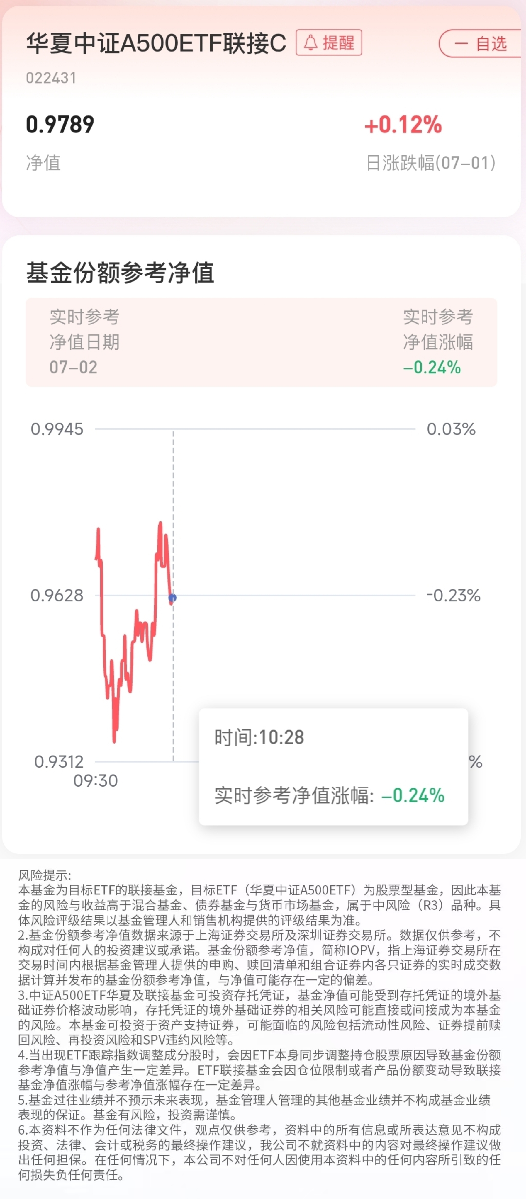 截止至2025年7月2日10:28,本基金跟踪目标基金的实时参考净值涨幅为-0.24%,其跟踪的指数最新PB(市净率)为1.53,处于适中区间。