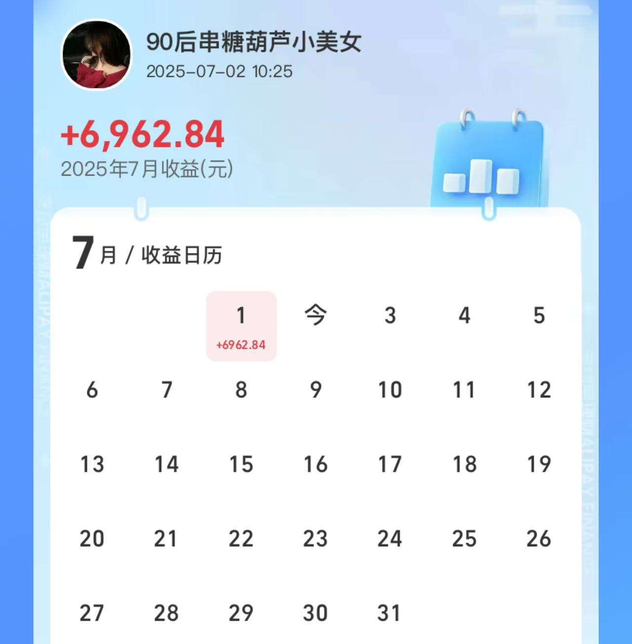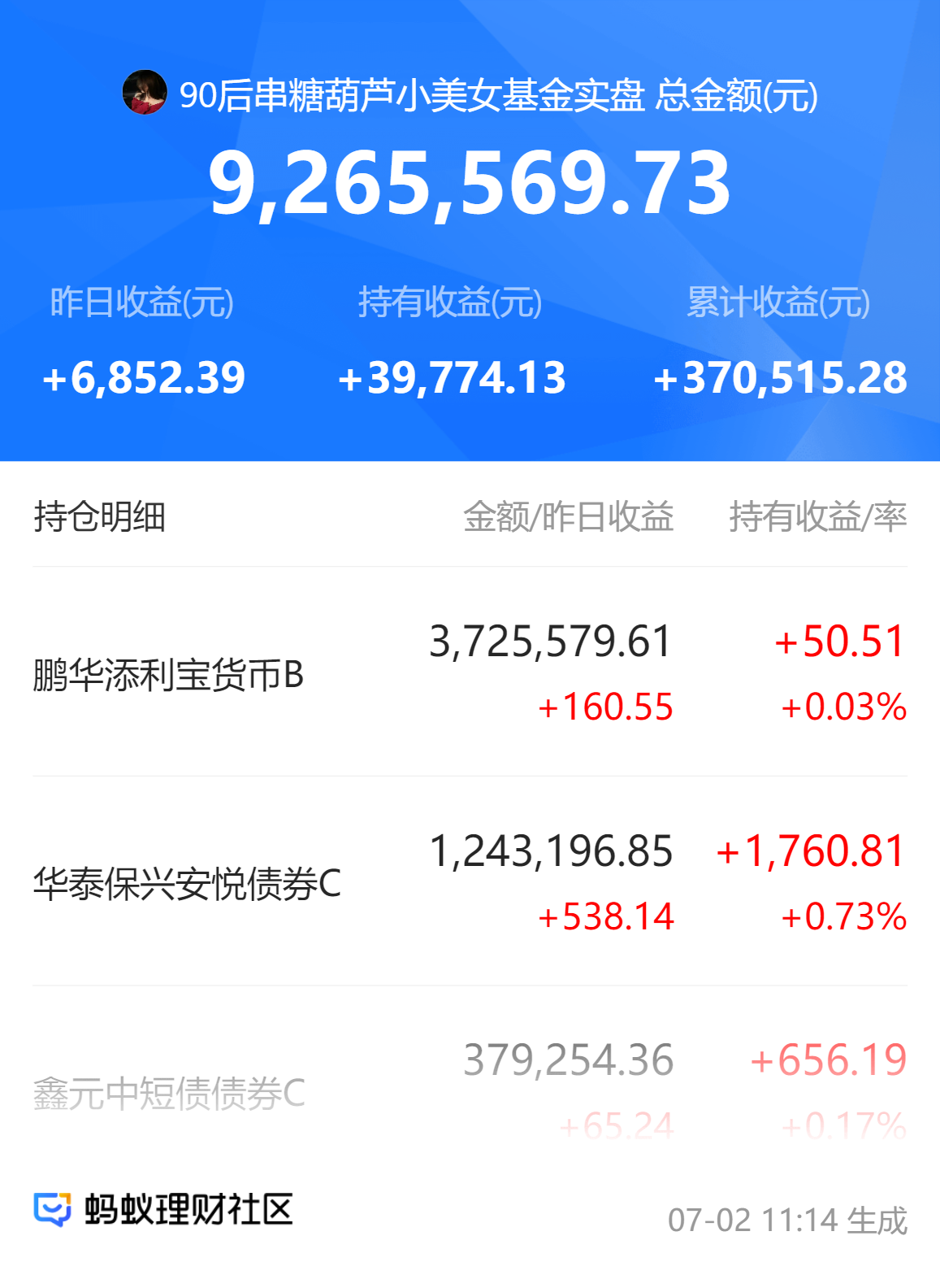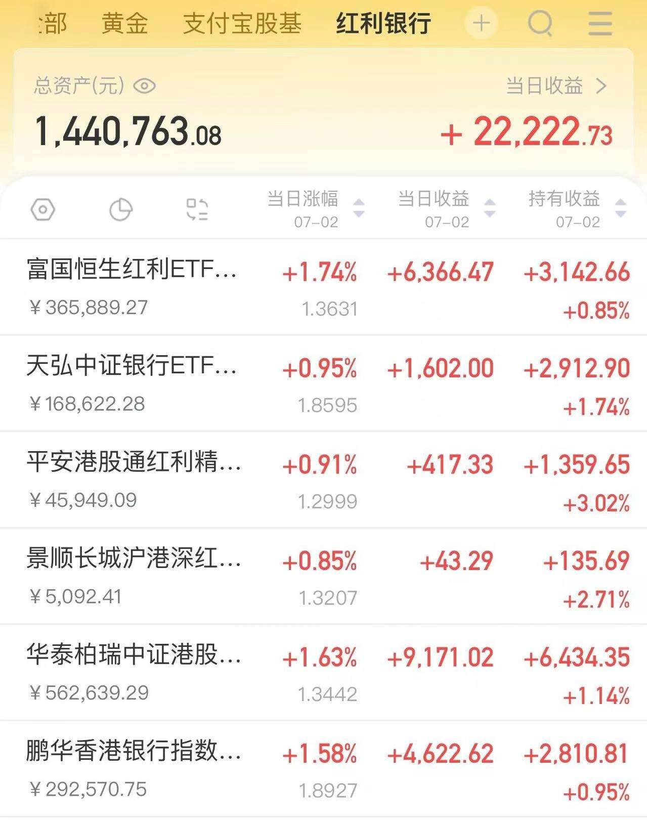 每日收益分享:7月喜迎开门红,昨晚小回7千不到,还是可以的了,毕竟我500多个在货币来着,所以对冲下来能小赚点就很满足了!今天看盘面债市延续上涨态势,银行和港股红利板块也都不错,所以保持住的话,我今晚应该收益也不错哈,希望能保持住,7月能在回来一半我也满足了!