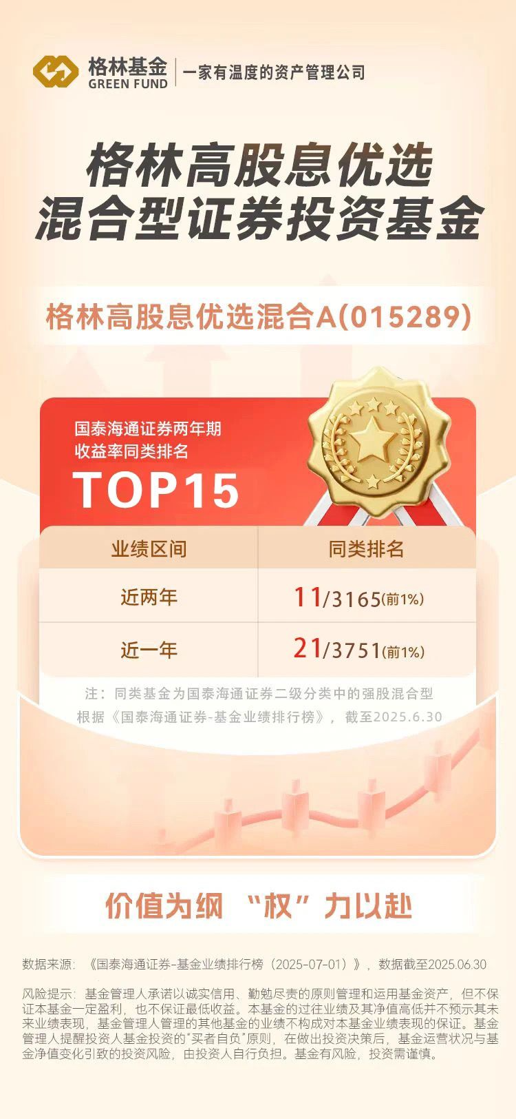 国泰海通证券数据显示,格林高股息优选混合A近两年以来收益率同类排名为11/3165,同类TOP15。近一年以来收益率同类排名为21/3751,均位于前1%。(数据来源:iFinD,《国泰海通证券-基金业绩排行榜(2025-07-01)》,数据截至2025.06.30)