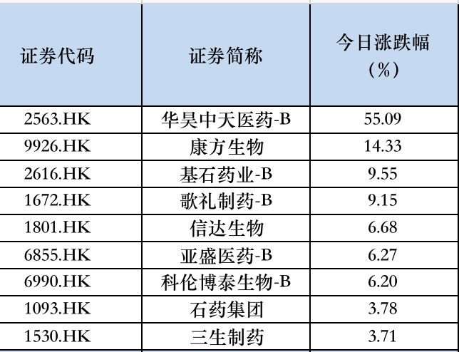港股创新药逆市大涨,华昊中天医药涨超55%,康方生物涨14.33%,基石药业涨9.55%,信达生物涨6.68%,亚盛医药涨6.27%,科伦博泰生物涨6.2%。