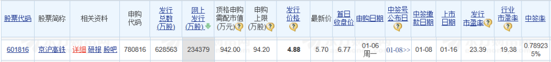 1)2020年的京沪高铁网上发行量234,379万股,中签率0.8%左右。