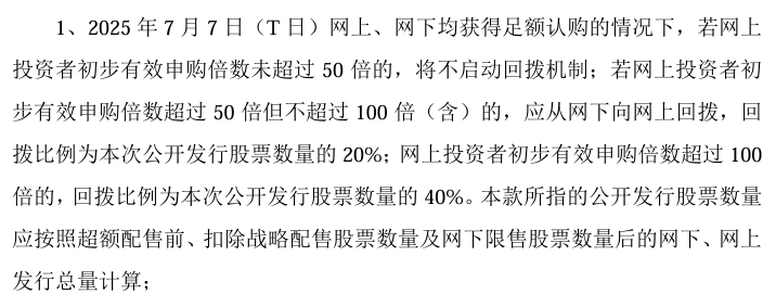1)关于回拨的规定:网上投资者初步有效申购倍数超过100 倍的,回拨比例为本次公开发行股票数量的40%。