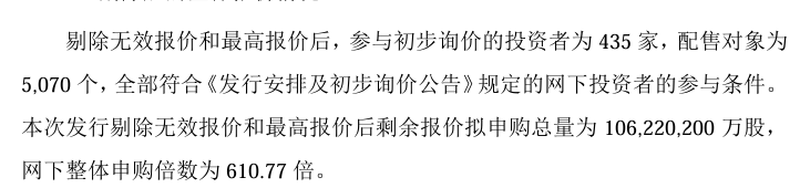 9. 网下初始的认购倍数是610.77倍,中签率约0.16%。如果网上认购超100倍,回拨后认购倍数认购倍数1026.09倍,中签率约0.10%。虽然网下中签率低,但是不用缴纳保证金,只要按照实际中签金额缴款即可。