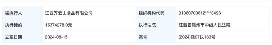 天眼查还显示,2024年8月15日,齐云山食品还曾新增一条被执行人信息,相关案由是建设工程合同纠纷,执行标的达到约1537.43万元。