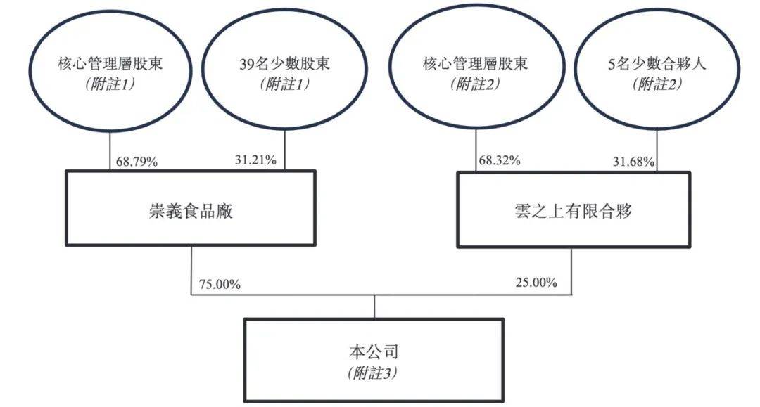 其中,核心管理层股东(分别包括刘志高、朱方永、刘继延、杨玉兰、黄忠明和凌华山6人)分别持有崇义食品厂68.79%的股份以及持有云之上有限合伙68.32%的股份,由此可计算出核心管理层股东持有齐云山食品约68.67%的股份。