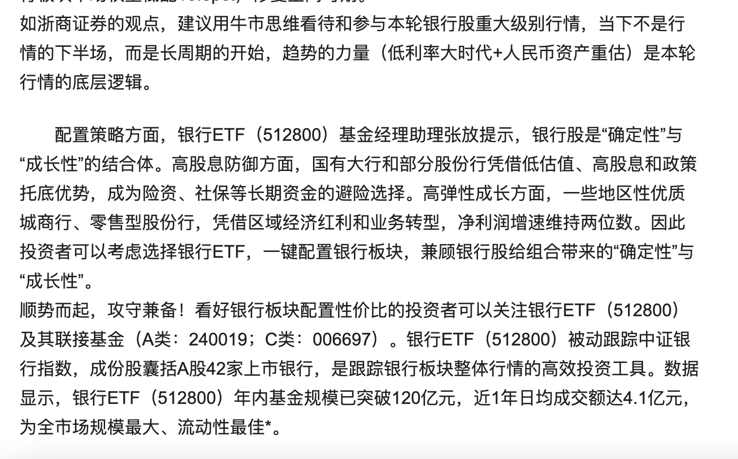 很多朋友还在私信问我银行板块还能买哪些银行?我说实话,银行的研究是一个非常复杂的系统工程,一般投资者没有办法深入研究到每一家银行的实际经营状况,所以我一般都会直接推荐银行ETF 512800(今天刚分拆,1拆2)他基本上同步与中证银行指数,过去一年多投资回报率非常高,还没有布局银行投资机会的投资者,其实最简单有效的就是买入ETF,别问我银行何时见顶,也别问我具体推荐的理由,关注我的投资者都很清楚的知道,我用了几十万字阐释过了银行的机会!