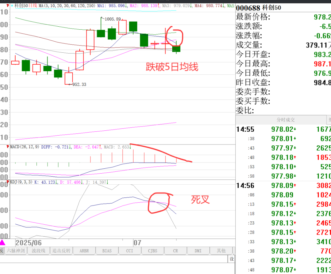 再看科创50指数,KDJ死叉,跌破5日均线,今天还在探底,所以你的股票也是如此状态,那就控制仓位,等~~等KDJ金叉,等收复5日均线,等MACD红柱放大了,再考虑加仓买回来,没有这些信号,必须控制仓位放在第一位!
