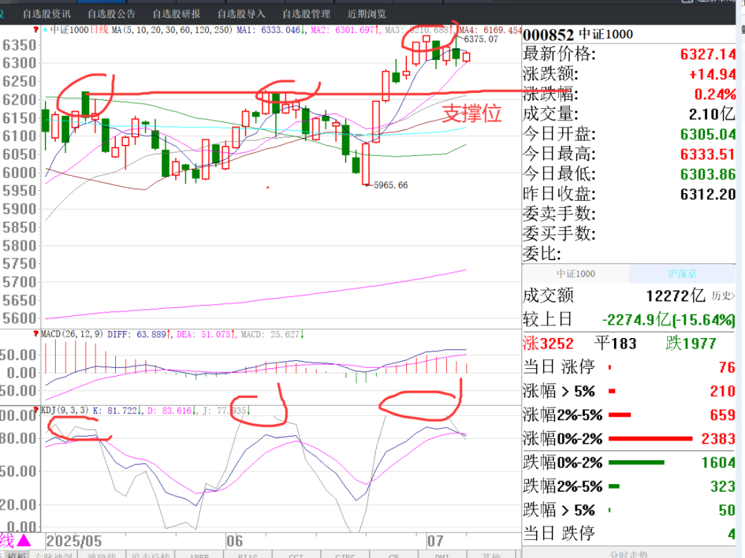 中证1000指数也是消化超买的指标,目前支撑位不破的话,代表有个股机会,炒股是炒个股,不是炒指数,这点要搞清楚,单纯指数来讲,目前围绕着支撑位震荡,或者说,等待20日均线上移,然后调整到KDJ金叉,收复5日均线,就是新的起飞信号,在这之前,指数不会出现主升浪的!