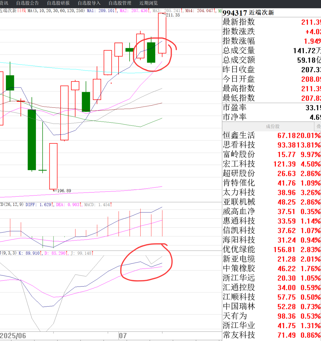 所以操作上,目前也是分化状态,我们看到近端次新股指数,由于5日均线没有死叉10日均线,KDJ没有死叉,MACD没有死叉,今天逆势大涨状态,如果你的股票技术面也是如此的话,那就持股待涨吧!