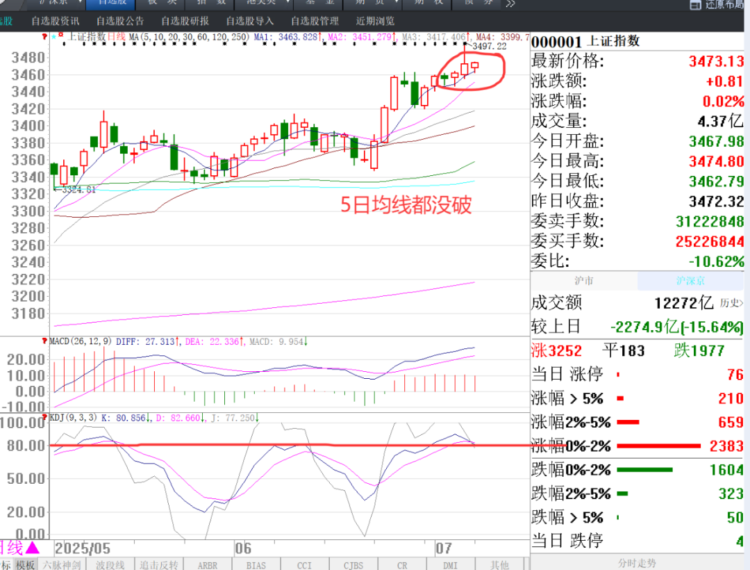 今天盘面上缩量2000多亿,但是上涨家数比下跌家数多,而且20cm个股达10家,整个一天黄线在上,白线在下,所以局部个股的机会还是蛮多的,主要原因,大盘技术面还没形成破位,我们看到大盘指数连5日均线都没破,只不过KDJ指标出现钝化后的回踩,目前KDJ虽然死叉了,但是没有跌破50,这就是市场分化的状态,把握好个股机会吧!【两市涨停板76家,跌幅大于5%的个股50家!】