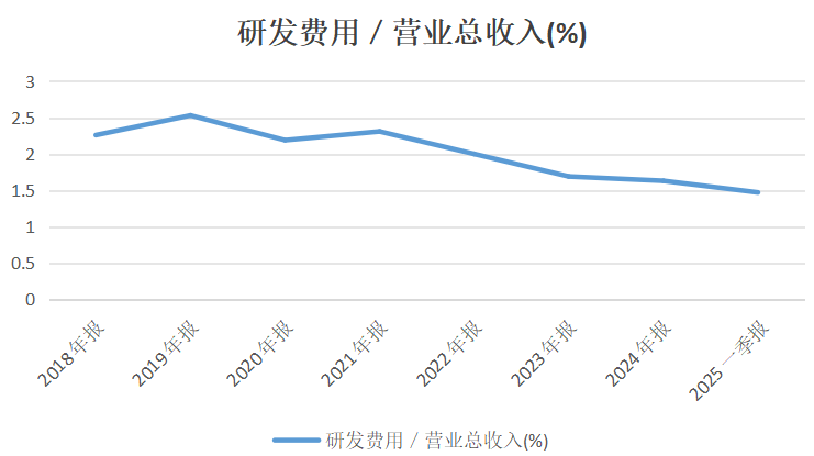 更令人担忧的是研发费用率的持续萎缩。财务数据显示,乖宝宠物研发支出长期徘徊在千万元级别,研发费用率呈现单边下滑态势:从2021年的2.31%逐年递减至2025年一季度的1.47%。