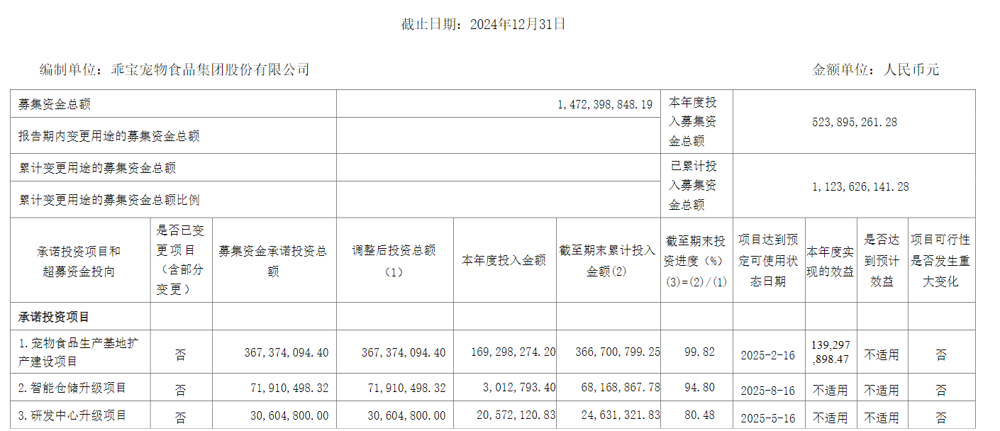 值得注意的是,这并非乖宝宠物首次加码仓储物流建设。根据2023年上市时的募投计划,公司曾投资7191.05万元建设智能仓储项目,其中设备购置费占比74.12%(5330.21万元),主要用于建设立体冷库和智能输送系统等设施;建筑工程费占比11.05%(794.48万元)。最新披露的募投项目专项报告显示,截至2024年底,该项目已完成94.8%的投资进度,预计将于下个月完成建设。