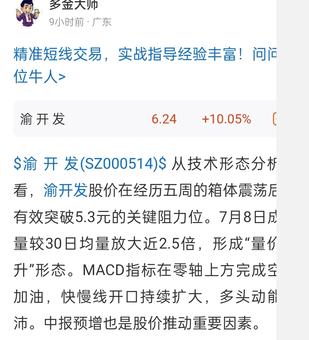 $渝 开 发(SZ000514)$ 看到我早间发的贴上车的朋友相信今晚都加餐了吧,早盘低开高走,午后拉升封板,今天晋级三连板成功。中报业绩是推动股价上涨的重要因素。