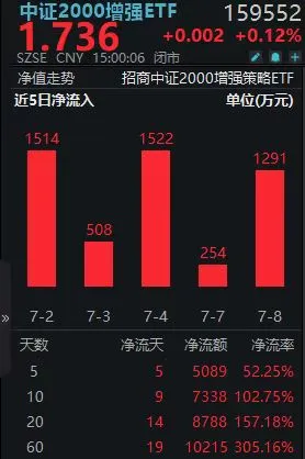 实际上,最近就有很多人在买中证2000增强ETF(159552.SZ),冲的人非常多,近5个交易日全部是净流入的,规模今年以来增长了8倍多!