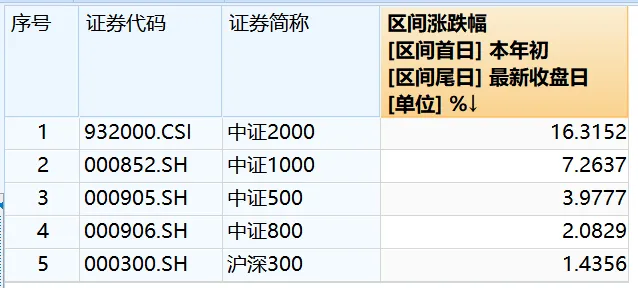 从年初以来,在市场主要的宽基指数中,中证2000的涨幅是最大的,今年以来的涨幅超过了16%,远远跑赢沪深300、中证800、中证500等宽基。