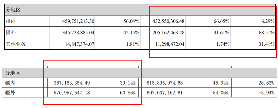 对比2019年和2024年的收入构成,疆内市场由4.33亿下滑到3.67亿,疆外市场由2.05亿上涨到5.71亿。