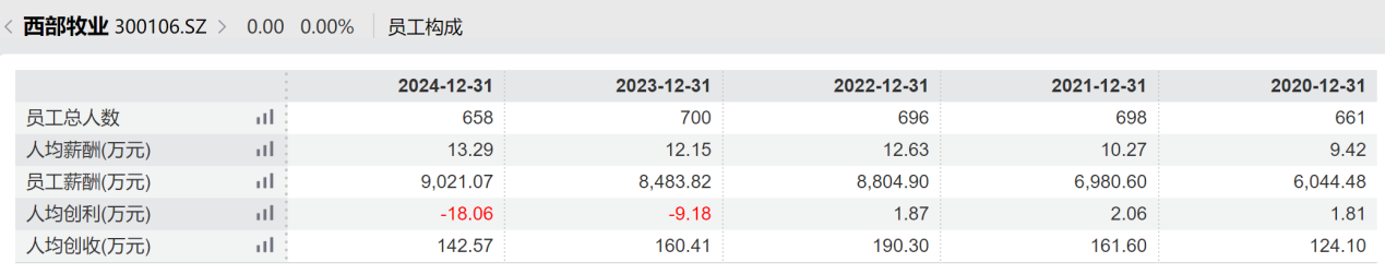 更加不可思议的是,尽管亏损越来越多,但员工工资却越来越高。例如,2020~2024年间,西部牧业的员工数量由661人减少3人到658人,但员工总薪酬却由约0.60亿上升到约0.90亿,员工人均薪酬从9.42万元/年上升到13.29万元/年,相当于平均每年涨薪8%。
