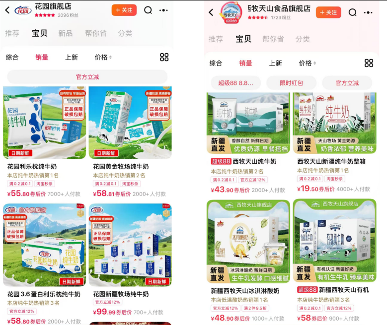 图片说明:“花园”和“西牧天山”两个品牌在天猫的销量,数据来源于天猫APP